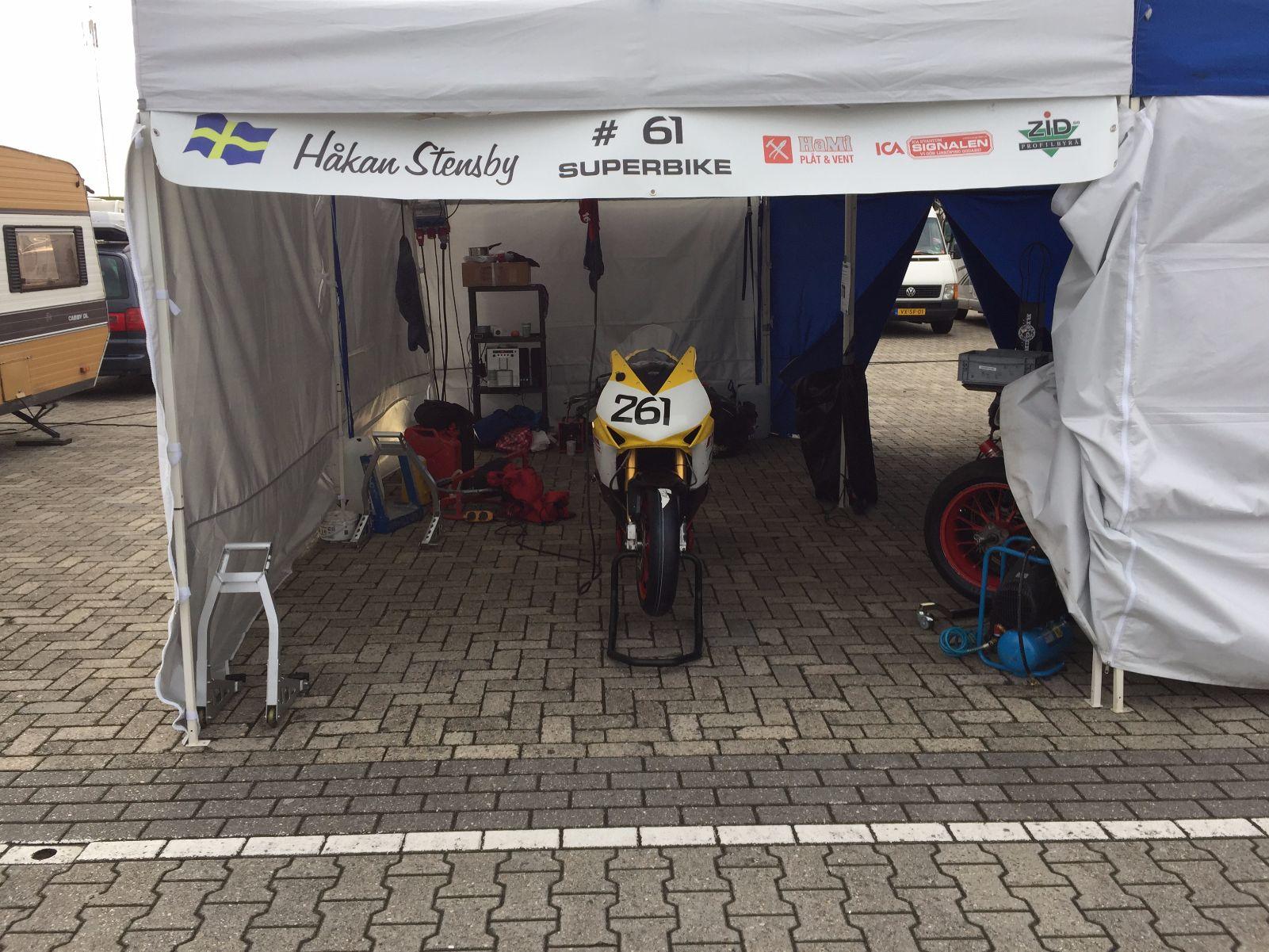 Fredagen då, vad göra? joooo man åker såklart till Ten Kate och hälsar på! Kervin Bos som visade mig runt i alla verkstäder, skrymslen och vrår på hela stället, tyvärr var det inte så mycket hojar på plats för det var WSBK i Magny Cours den här helgen också. Såklart handlade man lite godsaker i butiken och sen lite mat med familjen på en liten mysig restaurang. Tält nummer två sattes upp på förmiddan innan vi drog iväg, mycket som ska packas ut och sättas upp 🙂